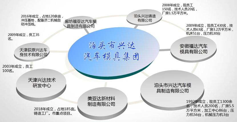 泊头市兴达汽车模具制造有限公司成立于1992年,是从事汽车覆盖件产品、模具设计制造、冲压件生产的技术厂家。下设7个分公司、3个技术中心,公司占地850亩,建筑面积18万平方米。现有职工1680余人,其中技术人员308人;年产值8.6亿元、铸造年产值1.6亿元。